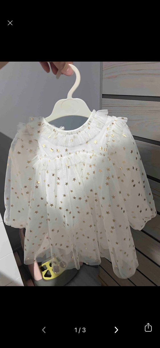 Beyaz renkli, kısa kollu, yuvarlak yakalı kız çocuk elbisesi. Bohem tarzda, altın yıldız baskılı ve fırfır detaylı, sentetik yumuşak kumaştan yapılmıştır. ✨