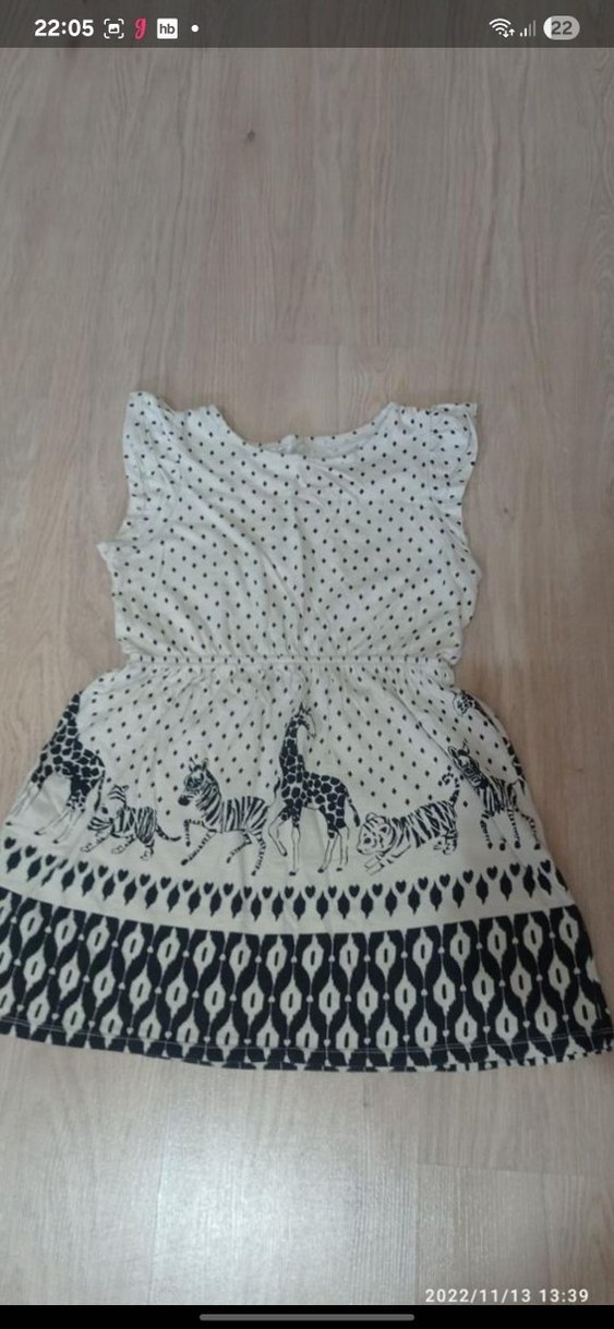 V yaka, kolsuz, bol kesim beyaz elbise, zebra ve geometrik desenlerle fırfır detaylıdır. Yumuşak sentetik kumaştan üretilmiştir.