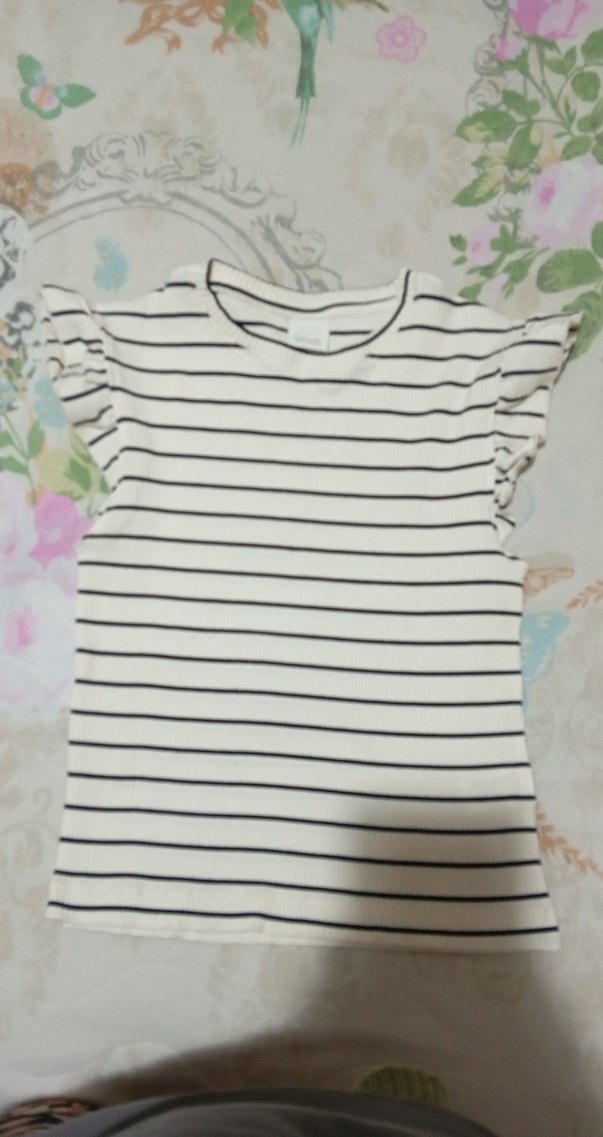Pamuk kumaştan yapılmış, kısa kollu ve yuvarlak yakalı, beyaz zemin üzerine zebra desenli, fırfırlı kız çocuk tişörtü. Rahat ve şık bir sokak stili için uygundur.
