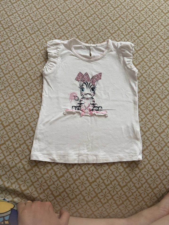 Kısa kollu, fırfırlı beyaz kız çocuk tişörtü, zebra desenli ve pembe fiyonk detaylıdır. Birkaç kez ancak kullanıldı.