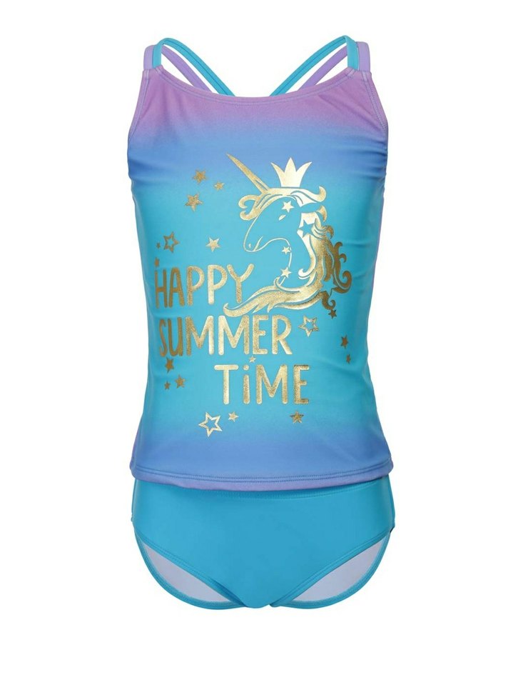 Kolsuz, bağcıklı, mavi tonlarında bağlama desenli kız çocuk tankini.Üzerinde altın renkli unicorn ve "HAPPY SUMMER TIME" yazısı bulunur.