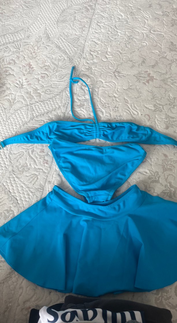 Turkuaz renkte, straplez boyundan bağlama askılı üç parçalı etekli, bikini takım.