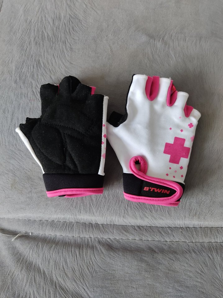 Renkli baskılı, pembe biker tarzı kız eldivenleri, yumuşak ve sıcak polar kumaştan, cırt cırtlı kapama ile rahat kullanım sağlar. decahlon btwin marka 6 yaş yazıyor ama 7.8 yasa da uyum saglar