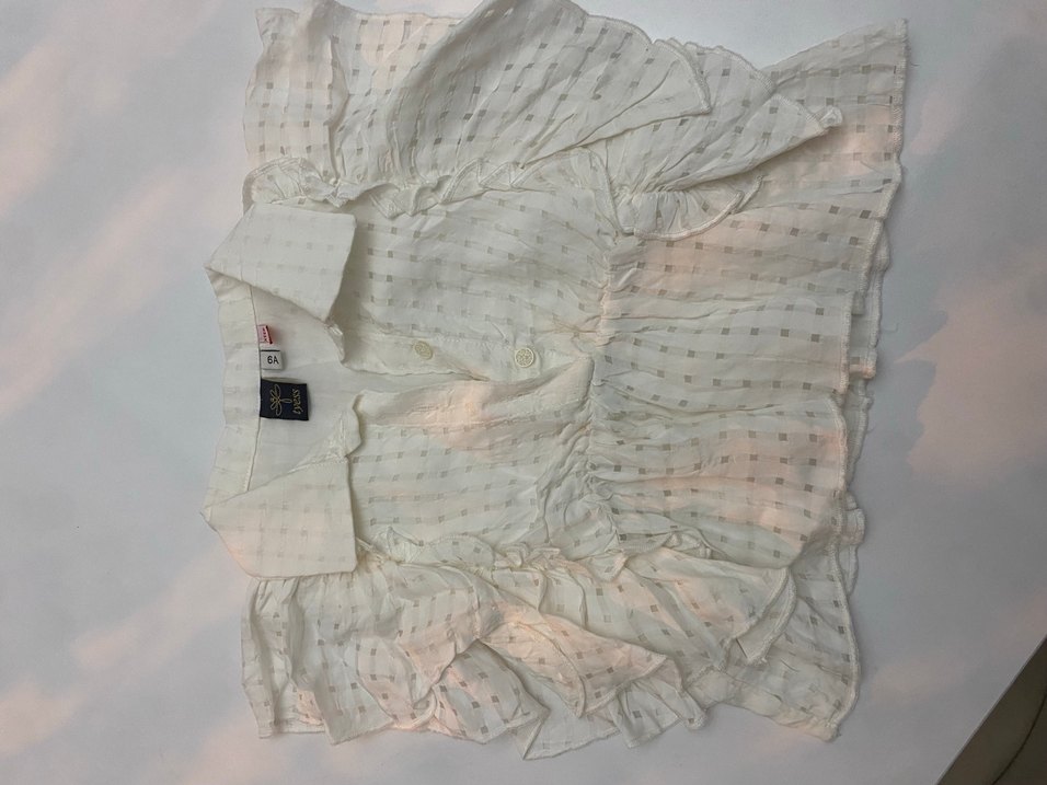 Bu beyaz kız çocuk bluz, V yaka ve kısa kollu, bol kesimdir. Nakışlı desenler ve fırfır detaylarıyla bohem tarz sunar.