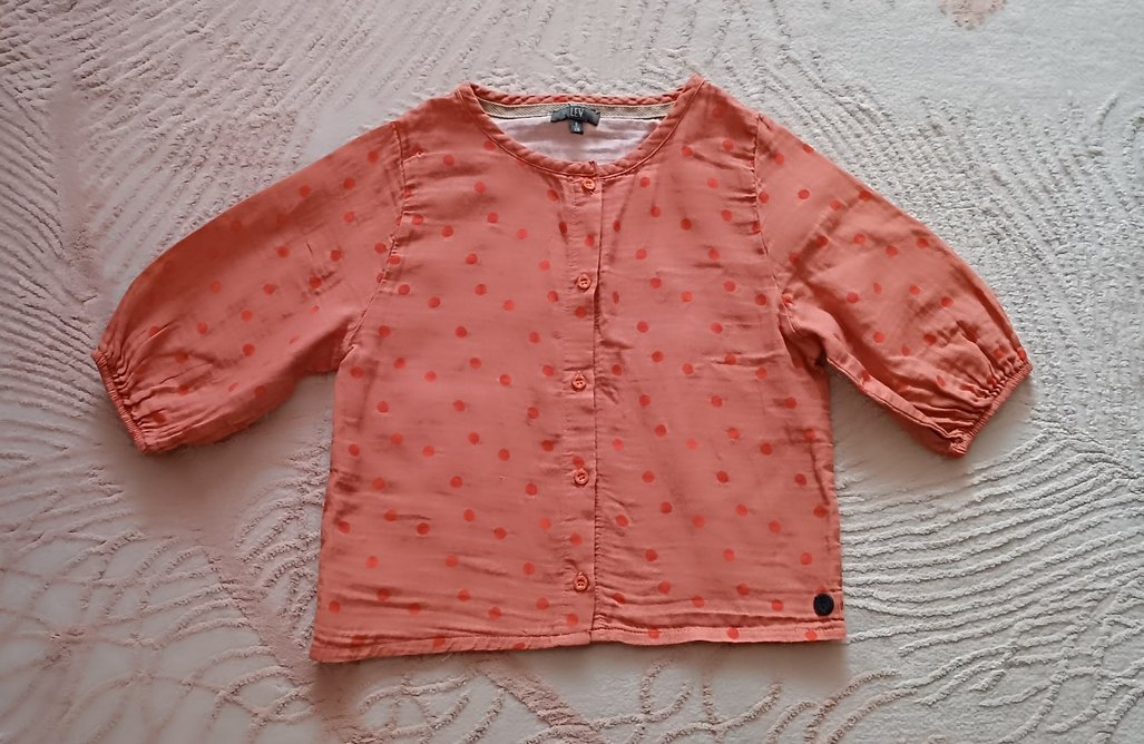 Tertemizdir,soft kiremit renkli, yarım kollu, yuvarlak yakalı kız bluzu. Düğmeli ve puantiyeli desenli, rahat kesim ve yumuşak müslin kumaştandır. 6-7 yaş için uygun.