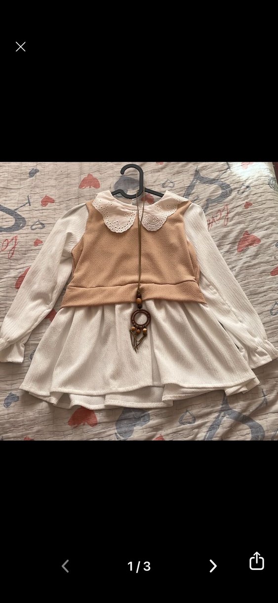 Uzun kollu, yakalı, düğmeli bej renkli örme kumaş yelekli bol kesim kız elbisesi. Pastel tonlarıyla bohem tarzını yansıtıyor. Hiç giyilmedi