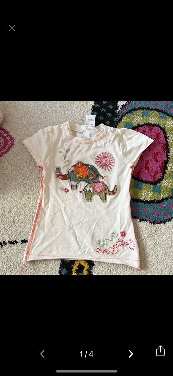 Kız çocukları için bohem tarzda, kısa kollu ve bisiklet yaka, pastel beyaz renkli, renkli fil baskılı, yumuşak kumaştan yapılmış dar kesim tişört.