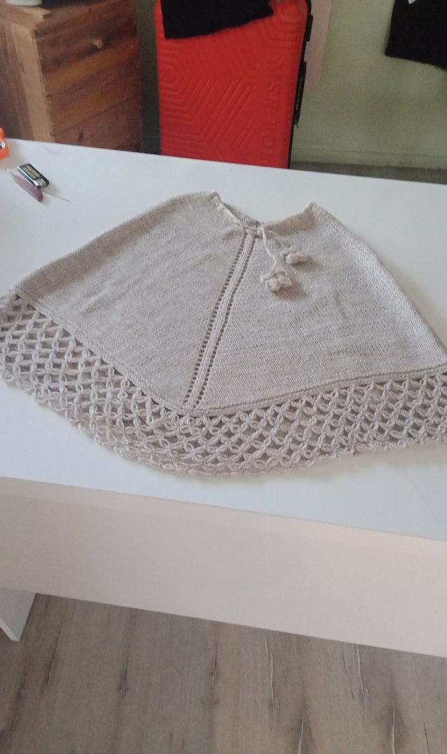 Kız çocukları için bohem tarzda, bej renkli, örgü kumaştan yapılmış, gevşek kesim ve yuvarlak yakalı panço. Alt kısmı açık örgü detaylı.