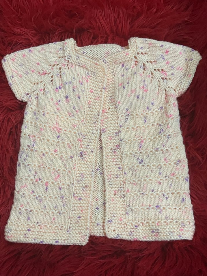 Beyaz ve pastel renkli noktalarla süslenmiş, kısa kollu, bol kesim örgü bohem tarzı kız çocuk hırkası. Yumuşak dokulu örme kumaştan yapılmıştır.