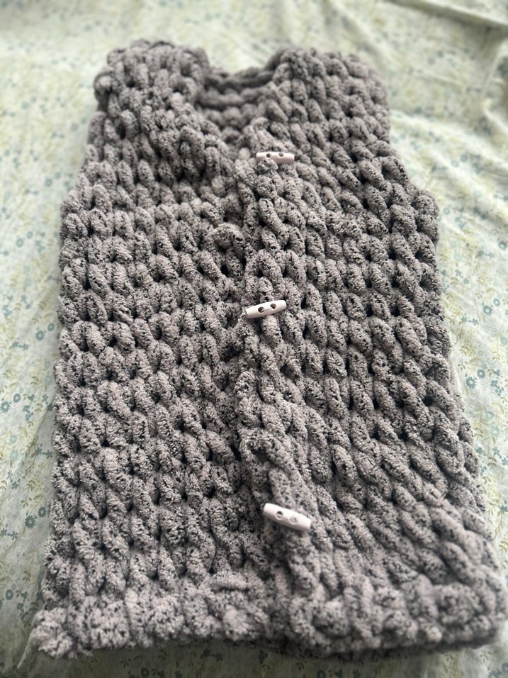 Gri renkli, boğazlı ve düğmeli, bohem tarzda, sıkı oturan kız çocuk triko yelek. Kolsuz ve kalın örgü detaylıdır.