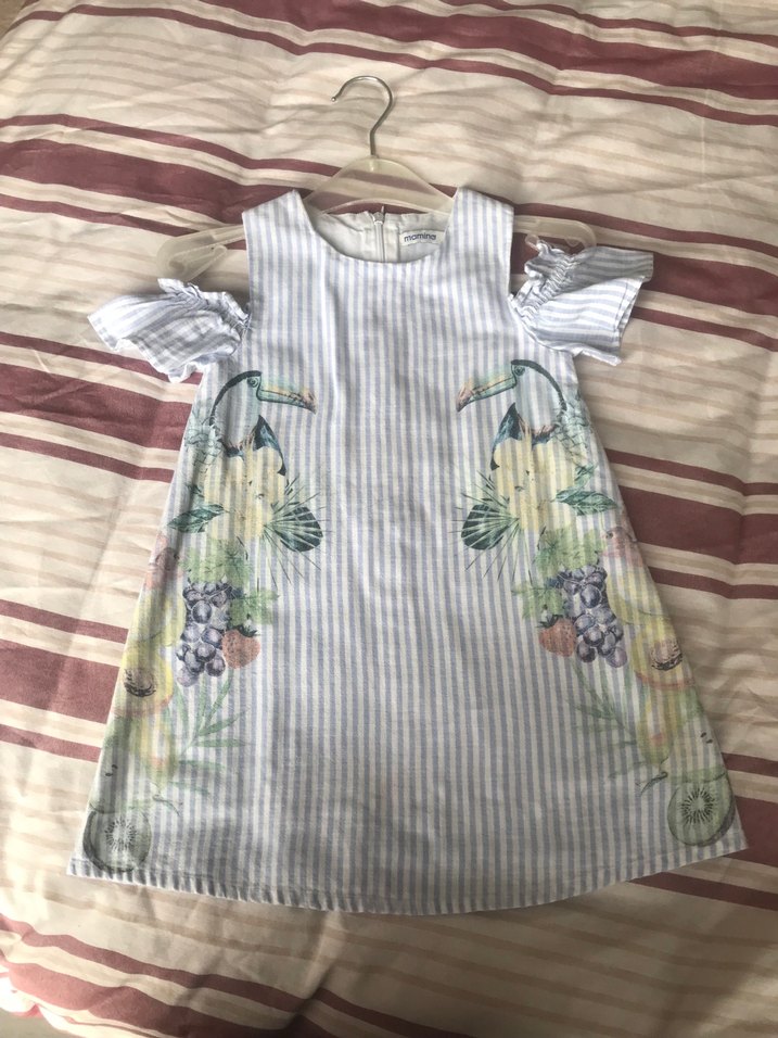 Kız çocuk elbisesi, kısa kollu ve straplez yakalıdır. Rahat kesimi, pilili detayları ve pastel çok renkli çiçekli baskısı vardır.