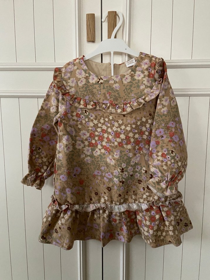 Uzun kollu, yakalı ve bol kesim kız çocuk elbisesi, kahverengi çiçekli desen ve fırfır detaylarıyla bohem tarzda .B.G baby kız bebek elbise sıfır sadece yıkandı 2 yaş ama 1.5 yaşa daha uyumlu temiz defosuz ve lekesizdir içi astarlı