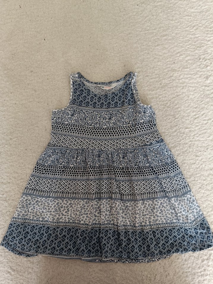 Kolsuz, bol kesim kız çocuk elbisesi, bohem bağlama desenleri ve fırfır detaylarına sahiptir. Yaka tipi kayık ve mavi-gri tonlardadır.