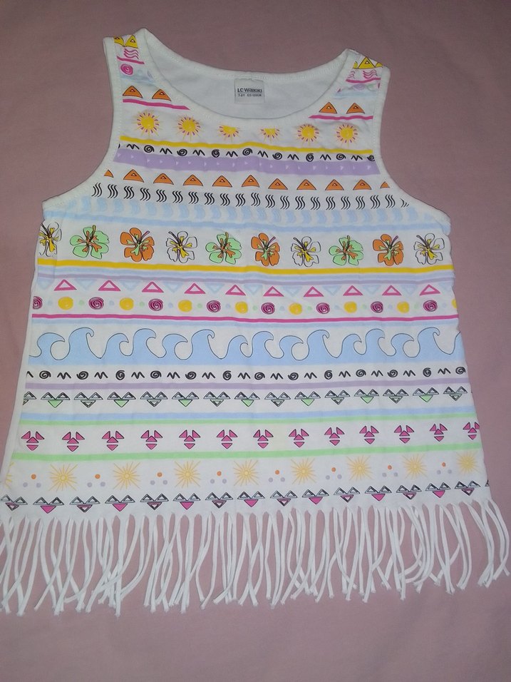 Kolsuz, bol kesim kız çocuk tişört,pastel renkli baskılar ve boncuk detaylarıyla. Askısız yakalı ve püsküllü alt kısmı bohem tarzını yansıtıyor.
