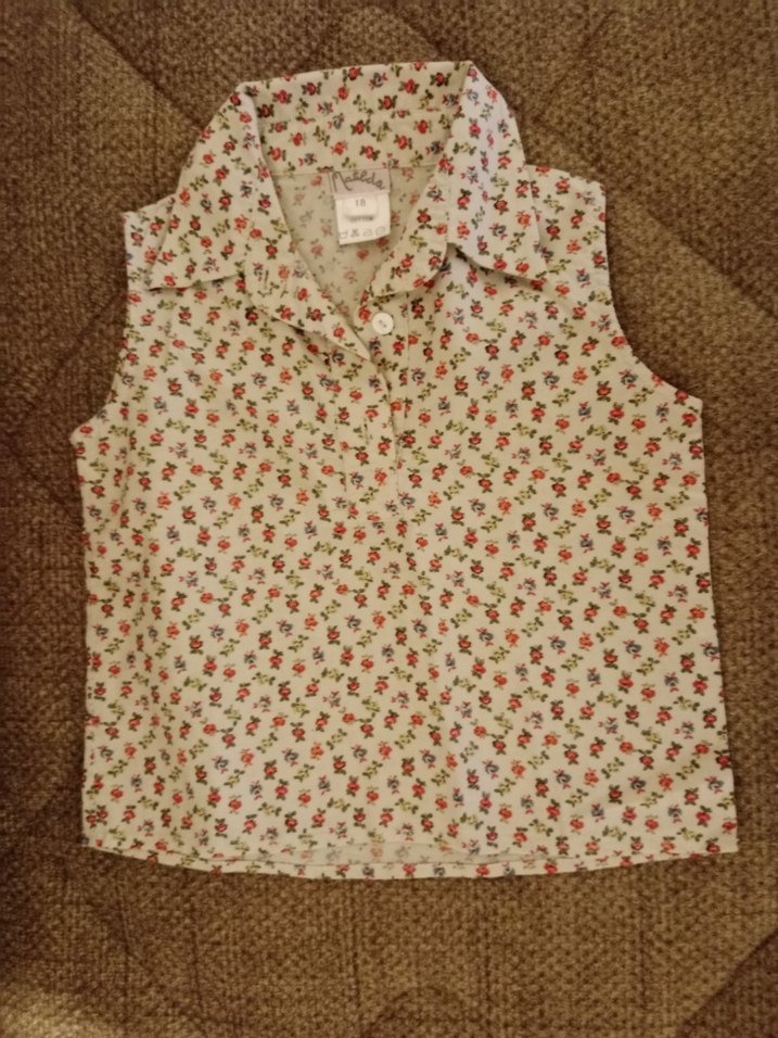 Kız çocukları için kolsuz, düğmeli ve yakalı bej gömlek. Bohem tarzda, küçük çiçek desenli ve bol kesimdir.