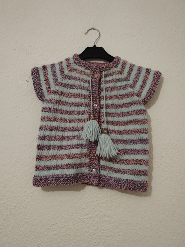 Kız çocuklar için kolsuz, bol kesim ve batik desenli örgü hırka. Ön kısmında püskül detayları bulunan bohem tarzda bir model. El örgüsüdür
