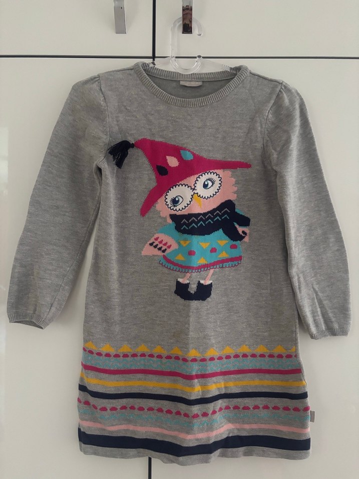 Gri renkli, uzun kollu, bol kesim örgü kız çocuk elbisesi. Önünde renkli baykuş baskısı ve çizgili etek ucu bulunur. Yuvarlak yaka, bohem tarz.