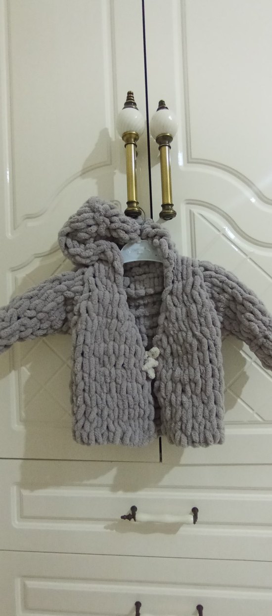 Kız erkek ortak renk için bohem tarzda, gri renkte, yumuşak örgü kumaştan yapılmış, uzun kollu ve sıkı kesim örgü hırka. kapşonlu yumuşacık 1.2 yaş için uygundur