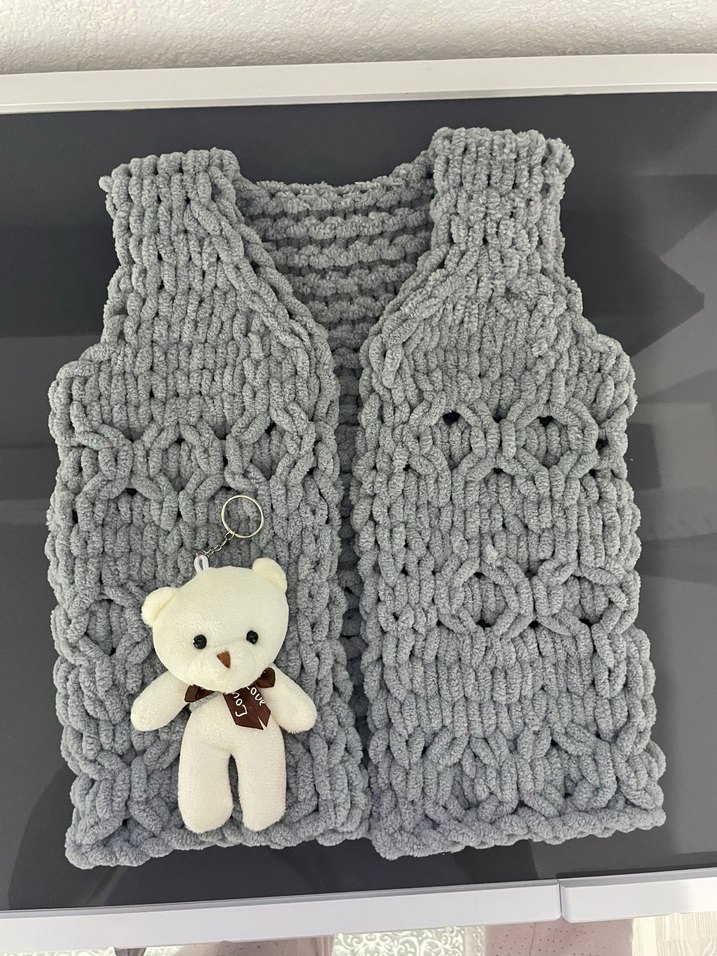 Fitted kesim, halter yaka ve yumuşak gri örgü kumaştan yapılmış kız çocuk yeleği yâda erkek için Bohem tarzında, kolsuz ve küçük oyuncak ayıcık aksesuarlı. Yaşa göre değişmektedir fiyat ama her şekilde fiyatta yardımcı olurum