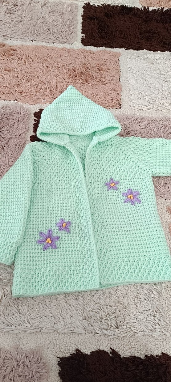 Bohem tarzda, kapüşonlu, uzun kollu, nakışlı çiçek desenli, yeşil tonlarında kız çocuk hırkası.