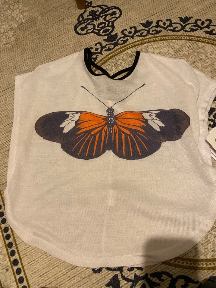 Kız çocukları için bol kesim, kısa kollu ve yuvarlak yakalı poncho. Açık kahverengi sentetik kumaş üzerine büyük kelebek baskısı ve dantel detayları içerir.