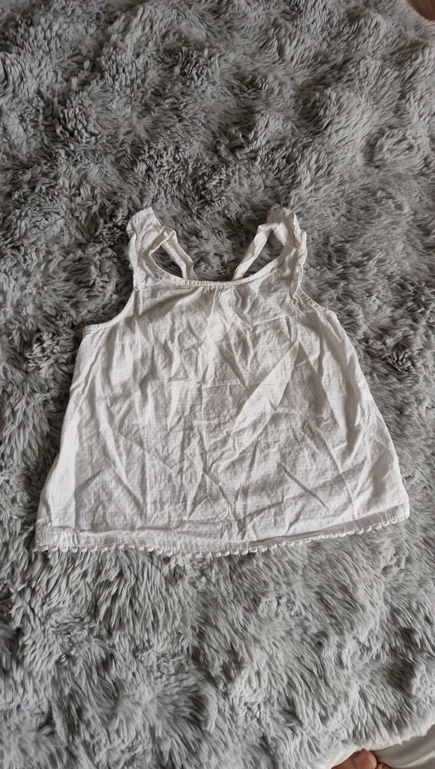 Keten kumaştan yapılmış, beyaz renkli, askısız ve fırfırlı detaylara sahip bohem tarzda bol kesim kız çocuk üstü. Desensiz ve hafif yapıda.