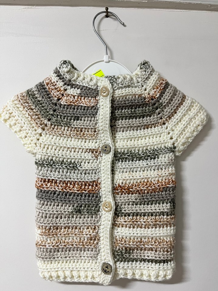 Kız çocukları için bohem tarzda, kısa kollu, bej ve gri tonlarda örme, düğmeli, bol kesim hırka.