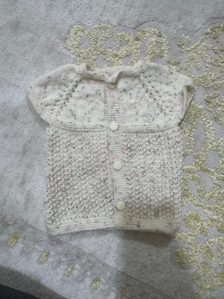 Beyaz renkli, kısa kollu, bol kesim bohem tarzında örme kız çocuk hırkasıdır. Desensiz ve yumuşak örgü kumaştan yapılmıştır.