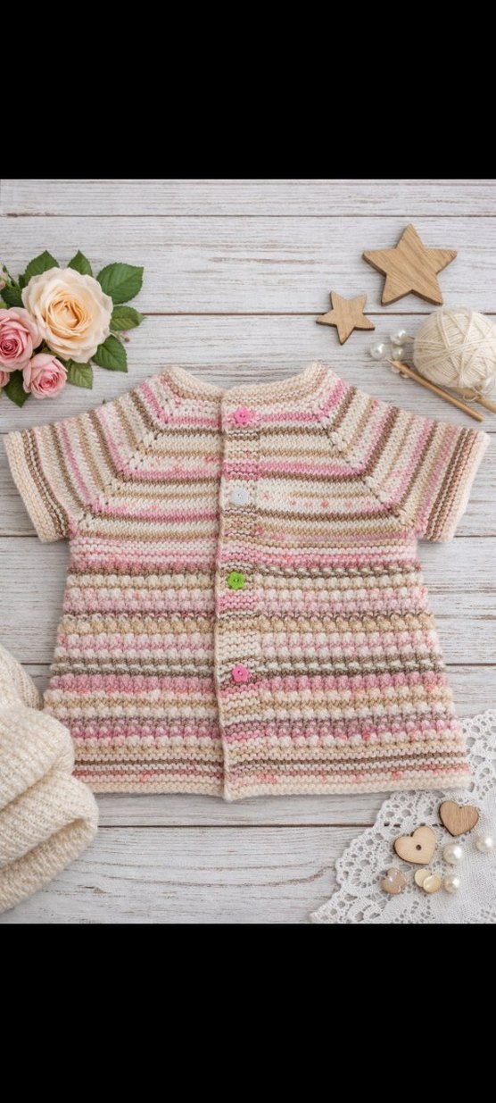 Bohem tarzda, pastel bej tonlarında, kısa kollu ve bol kesim kız çocuk örgü hırka. Renkli düğmeler ve desenli çizgili örgü detayları bulunur.