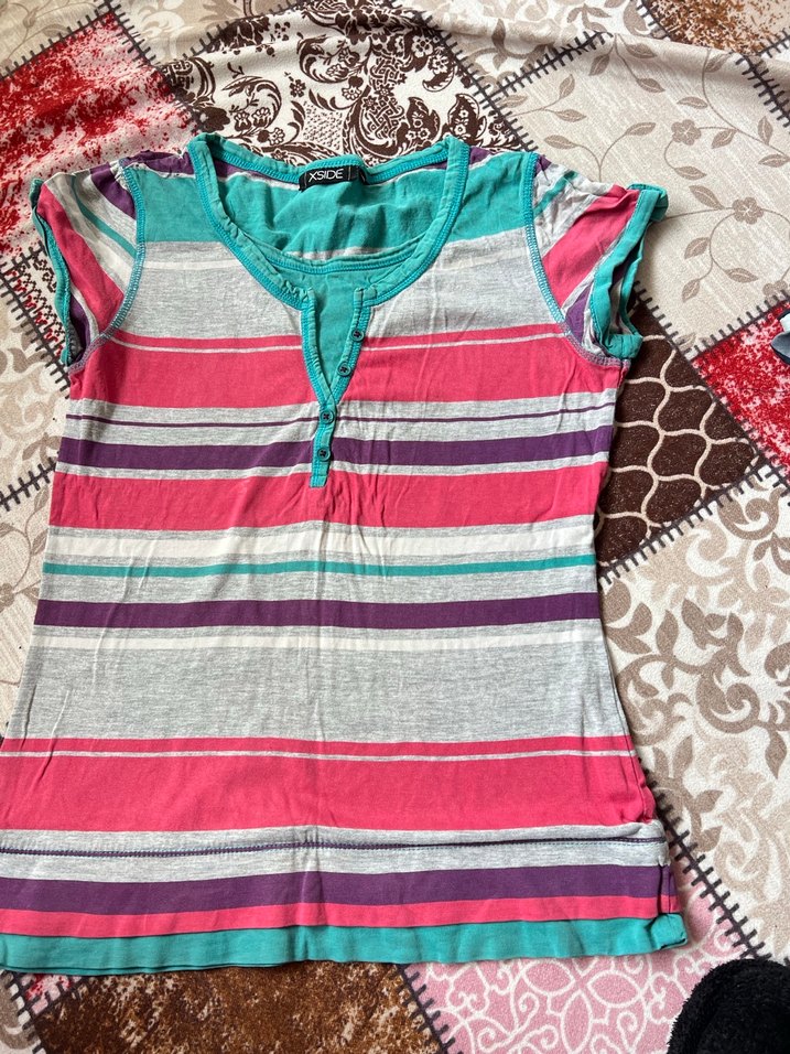 Bohem tarzda, kısa kollu, V yaka, bol kesim kız çocuk tişörtü. Pastel çok renkli çizgiler ve dantel detaylara sahiptir.