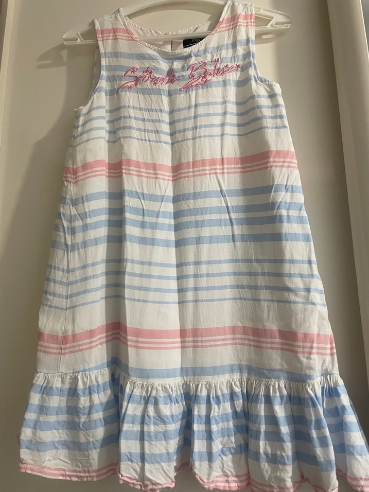 Pamuklu kumaştan, bohem tarzda, kolsuz, gevşek kesim kız çocuk elbisesi. Pastel renkli çizgili ve fırfırlı etek ucu bulunur.