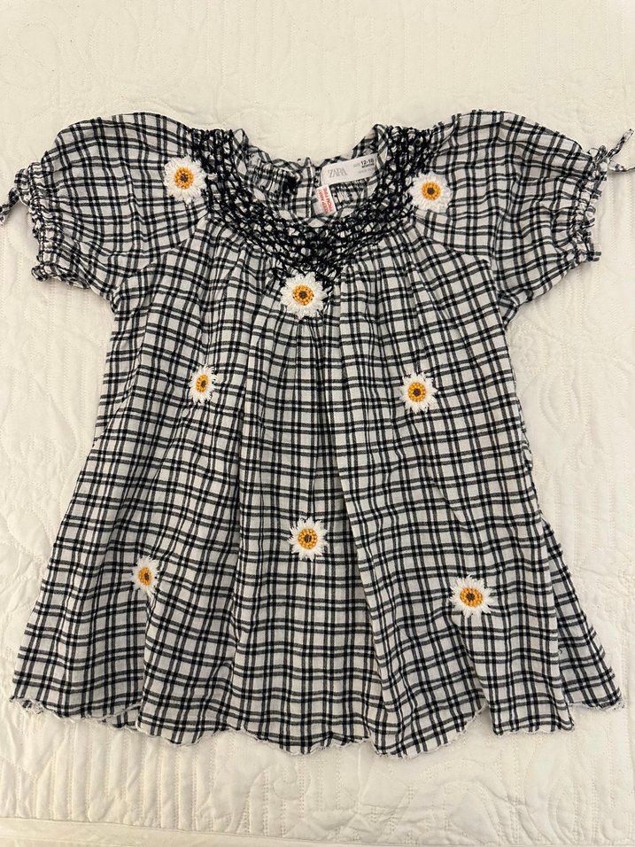 Kısa kollu, kayık yaka ve bol kesim kız çocuk elbisesi. Koyu kareli desen üzerinde nakışlı çiçek detayları ve fırfır süslemeleri bulunur.