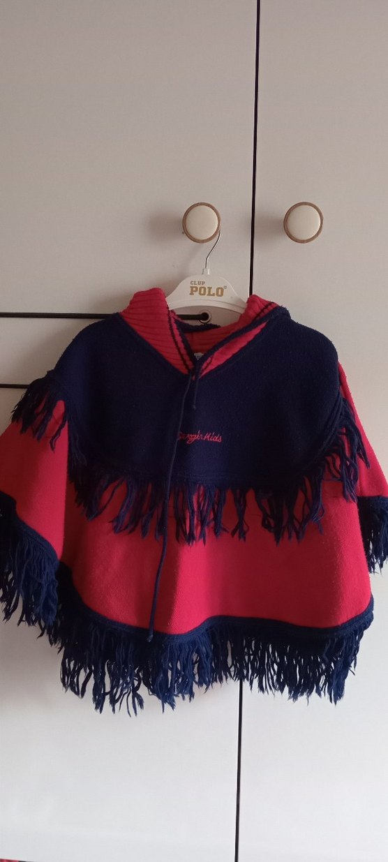 Renkli, kapüşonlu, uzun kollu, nakışlı ve püsküllü bohem tarzda kız çocuk panço. Yumuşak ve sıcak kumaştan üretilmiştir.