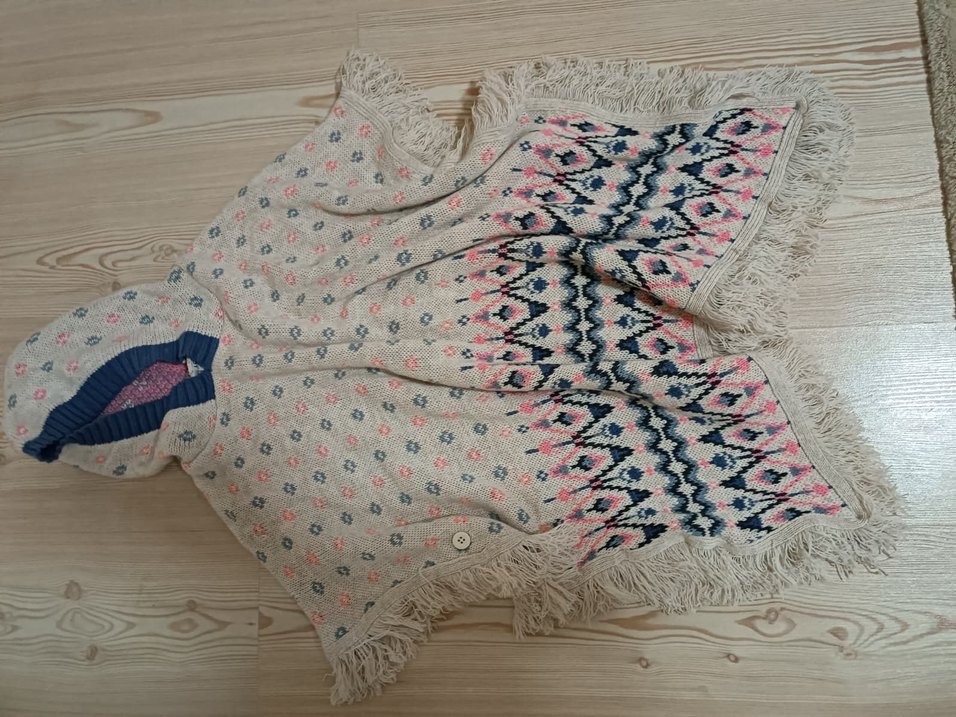 Nakışlı çok renkli desenlere sahip, uzun kollu ve yuvarlak yakalı kız çocuk pançosu. Bohem tarzda, örgü kumaş ve püskül detaylarıyla bol kesim.