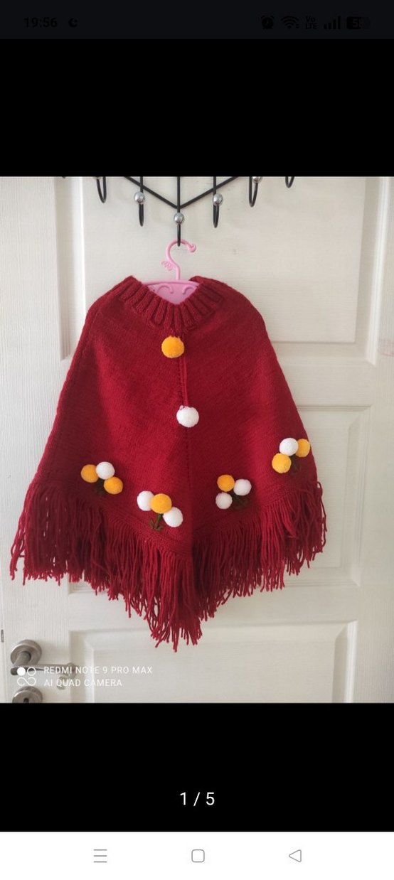 Renkli kırmızı örgü panço, nakışlı detaylar ve ponponlarla bohem tarzda. Salaş kesim, uzun kollu ve yuvarlak yakalı, püsküllü kenarlara sahip.