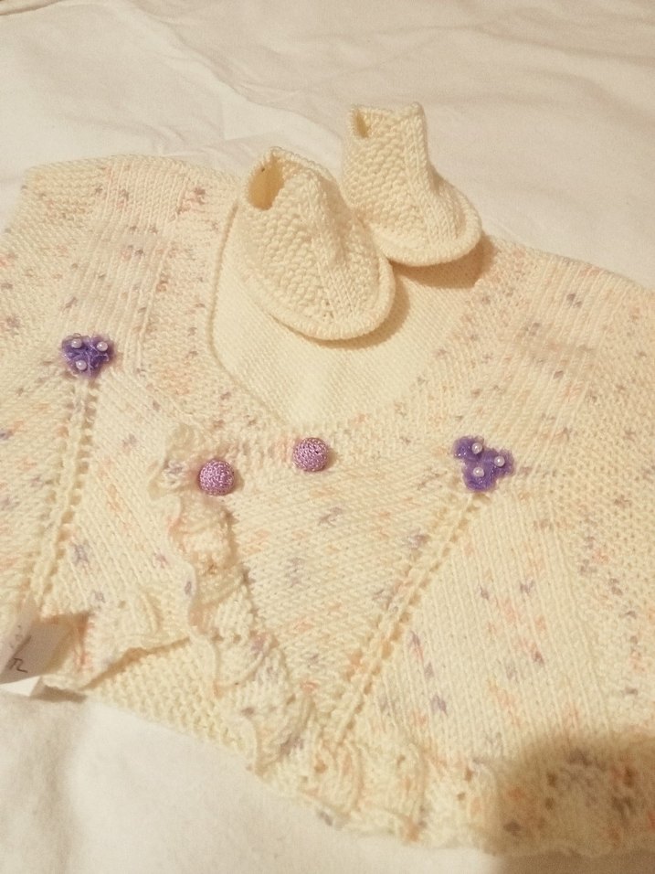 Pastel beyaz renkte, bol kesim ve uzun kollu kız çocuk bohem örgü hırka, mor süslemeli detaylarla tamamlanmıştır.