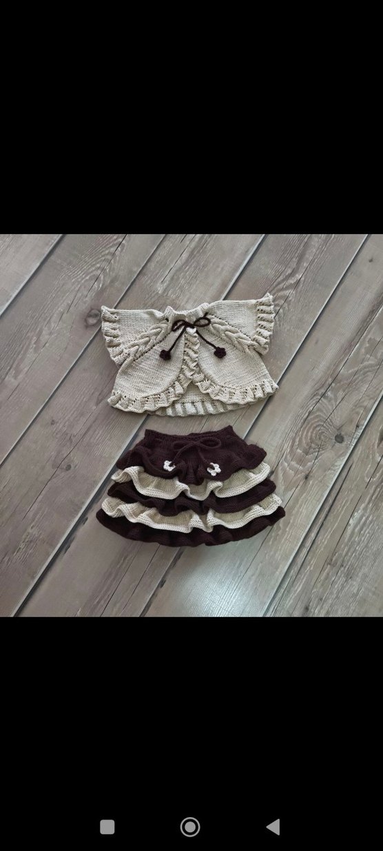 Örgü kumaştan, bolero ve etek takımı. Boleroda fırfır ve bağcık detayları, etekte kat kat fırfırlar ve nakış süslemeler bulunur. Rahat kesim, bohem tarzda.