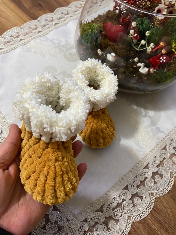 Kız çocukları için örgü, beyaz nakışlı manşetli, renkli bohem tarzda sıcak bot. Rahatlık ve sıcaklık sağlar.