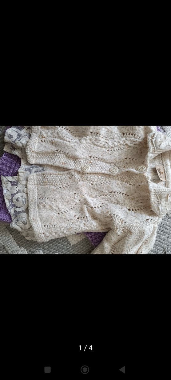 4-5 yaş.Bu beyaz renkli, bohem tarzda kız çocuk hırkası, örme kumaştan yapılmış ve vücuda oturan kesime sahip. Uzun kollu ve detaylı örgü deseni bulunur.