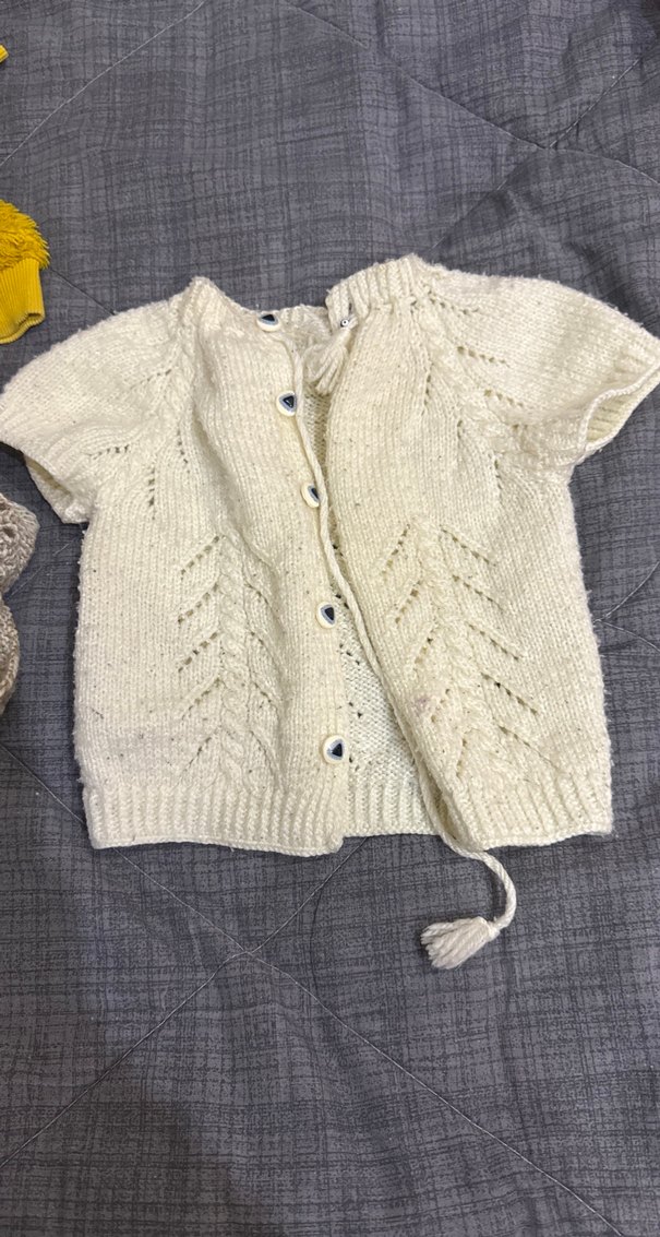 Kız çocukları için bohem tarzda, örgü, kısa kollu ve bol kesim hırka. Beyaz ve hafif gri tonlarda, desensiz tasarıma sahip.