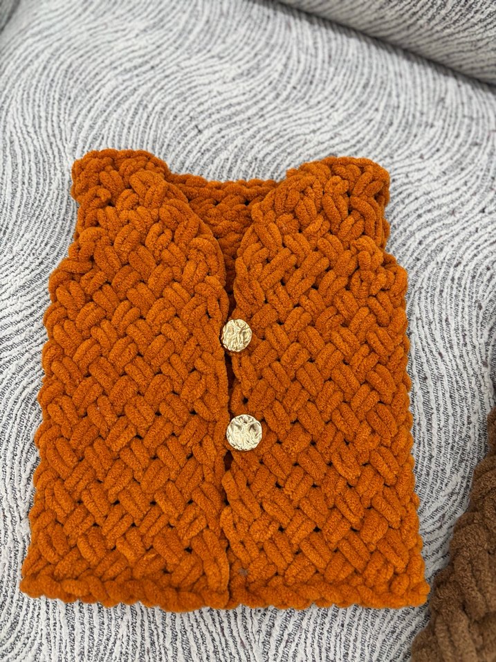 Renkli kahverengi örgü kız çocuk yeleği, boğazlı ve kolsuz, bohem tarzda, vücuda oturan kesime sahiptir.