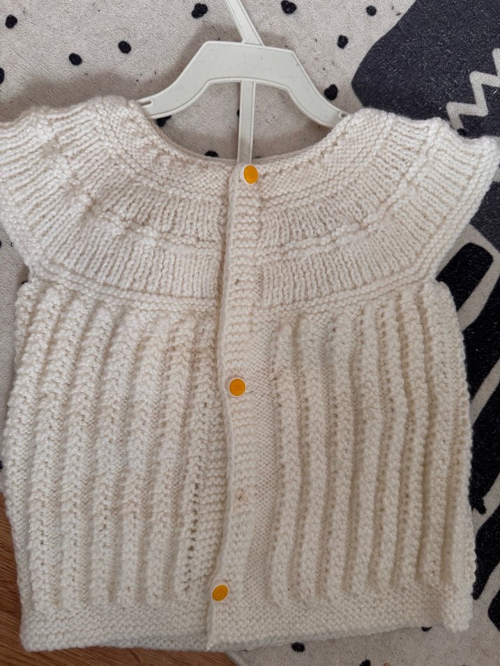 Kolsuz, bol kesim ve bohem tarzda, yumuşak örgü kumaştan yapılmış beyaz renkli hırka. Ön kısmında düğmeli ve dokulu örgü deseni bulunur.