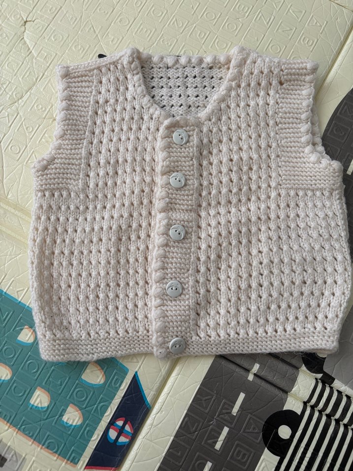 Kız çocuklar için beyaz renkte, düğmeli ve kolsuz örgü dokulu, bohem tarza sahip el emeği yelek. Pudra rengine yakındır .sorunu yoktur.1,5 yaşına kadar kullanılabilir
