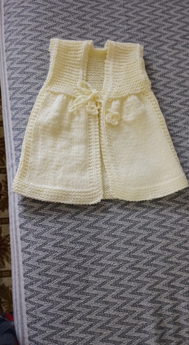 Kolsuz, bol kesim ve örgüden yapılmış yumuşak dokulu bir yelektir. Önünde bağlama detayı bulunan sade, bohem tarzda krem renktedir.