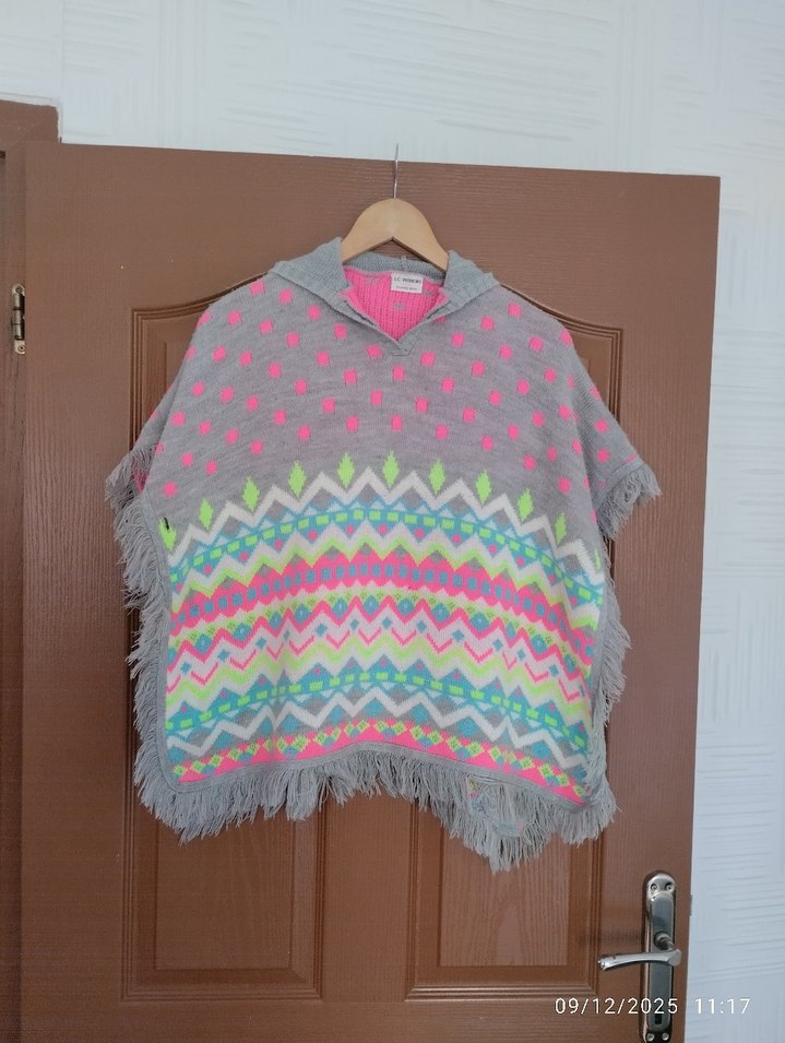 Kız çocukları için bol kesim, uzun kollu ve yuvarlak yakalı örgü pelerin. Gri zemin üzerine çok renkli tie-dye desenli ve püsküllü kenarlara sahip bohem tarzda. minik bir sökük vardı diktim ikinci resimde azıcık belli oluyor aslında olmuyor yakın dan bakınca biraz belli oluyor.