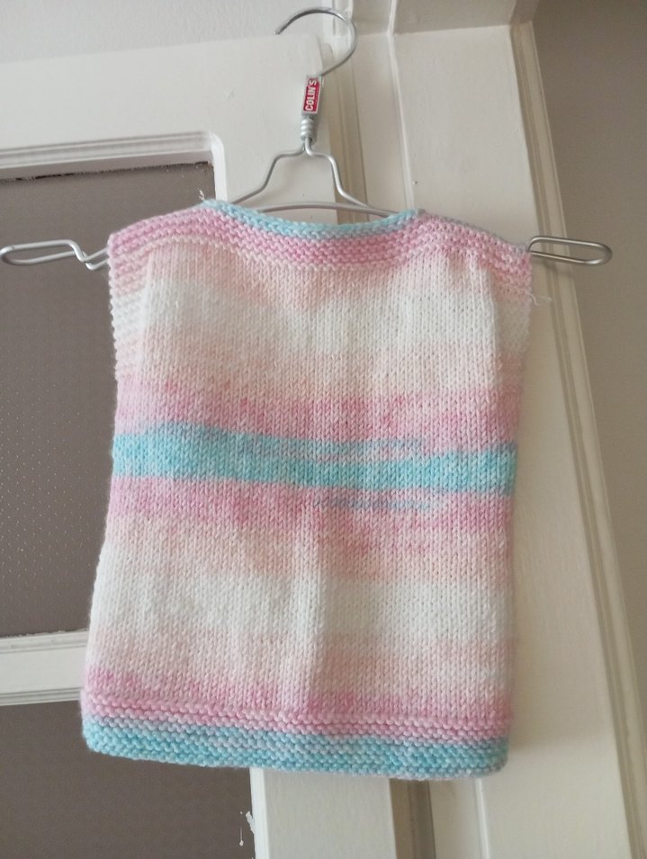 Pastel çok renkli, örgü kumaştan yapılmış, kolsuz, kayık yaka kız çocuk süveter. Bol kesim ve sade tasarıma sahiptir.