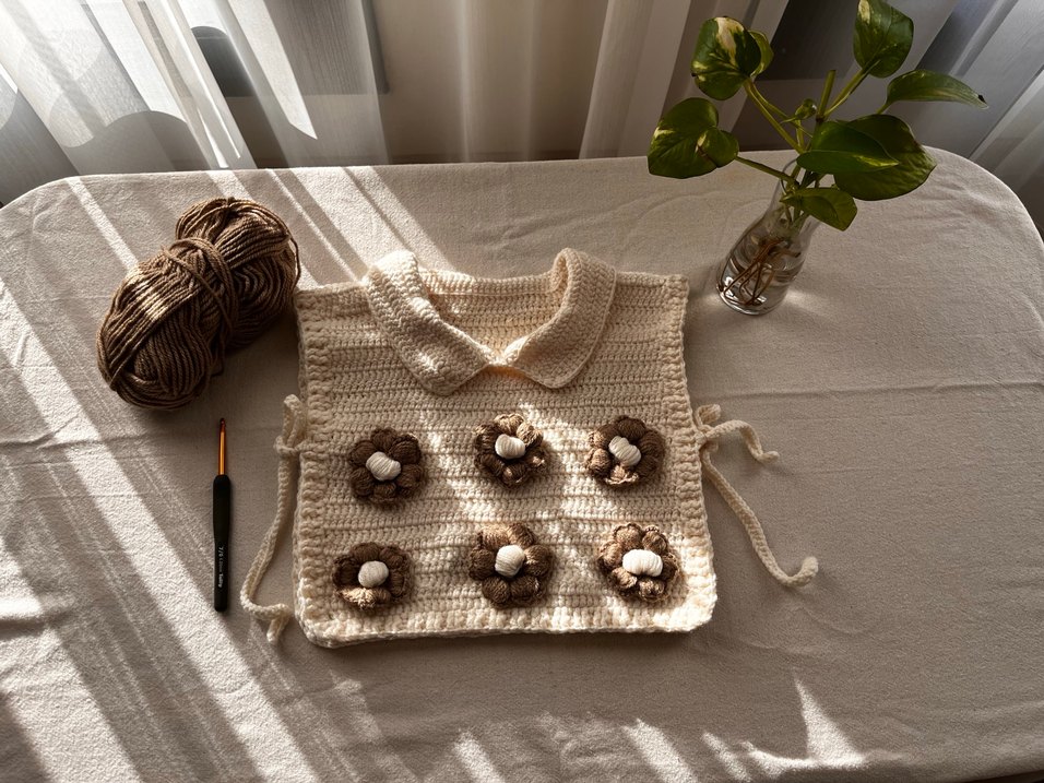 Kolsuz, örgü kız çocuk yeleği, bol kesim ve yakalıdır. Açık kahverengi zemin üzerinde kahverengi nakışlı çiçek desenleriyle bohem tarz sunar. Sıfır hiç kullanılmamıştır,istenilen yaşa göre örülür.
