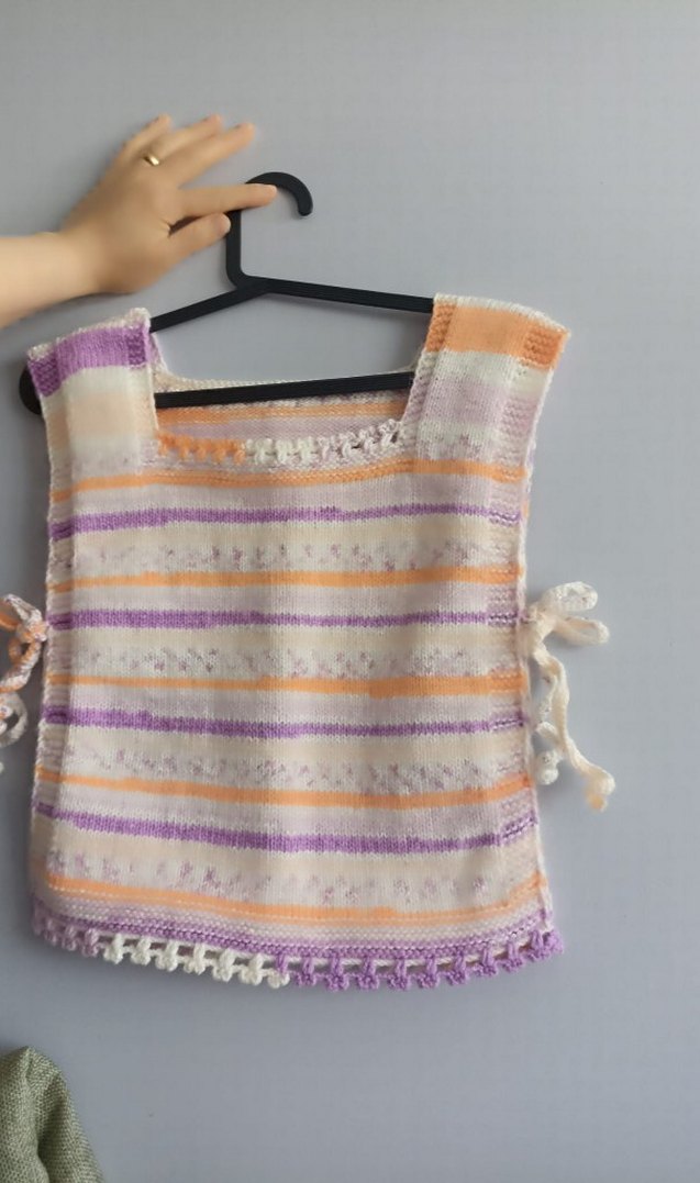 Kolsuz, bol kesim örgü yelek, tekne yaka ve yan bağcıklarla pastel çok renkli çizgili, bohem tarzda.#suveter