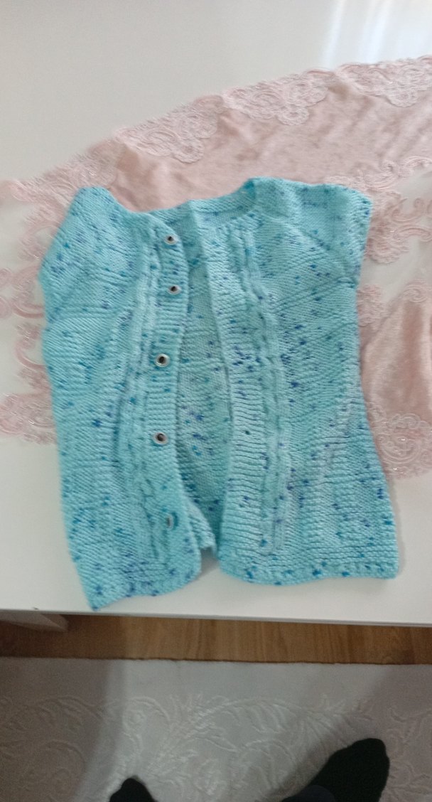 Kız çocukları için kolsuz, örgü yelek. Pastel mavi batik desenli, bohem tarzda ve bol kesim, boğazlı yaka detaylıdır.