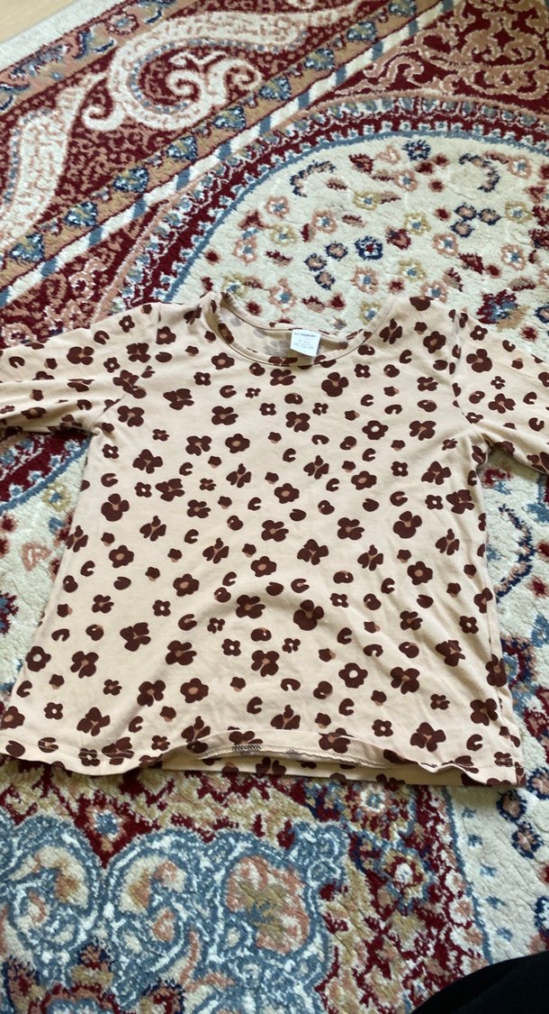 Pamuklu, uzun kollu, bol kesim kız tişörtü. Pastel kahverengi ve baskılı çiçek deseni ile bohem tarzda, dantel detaylı.